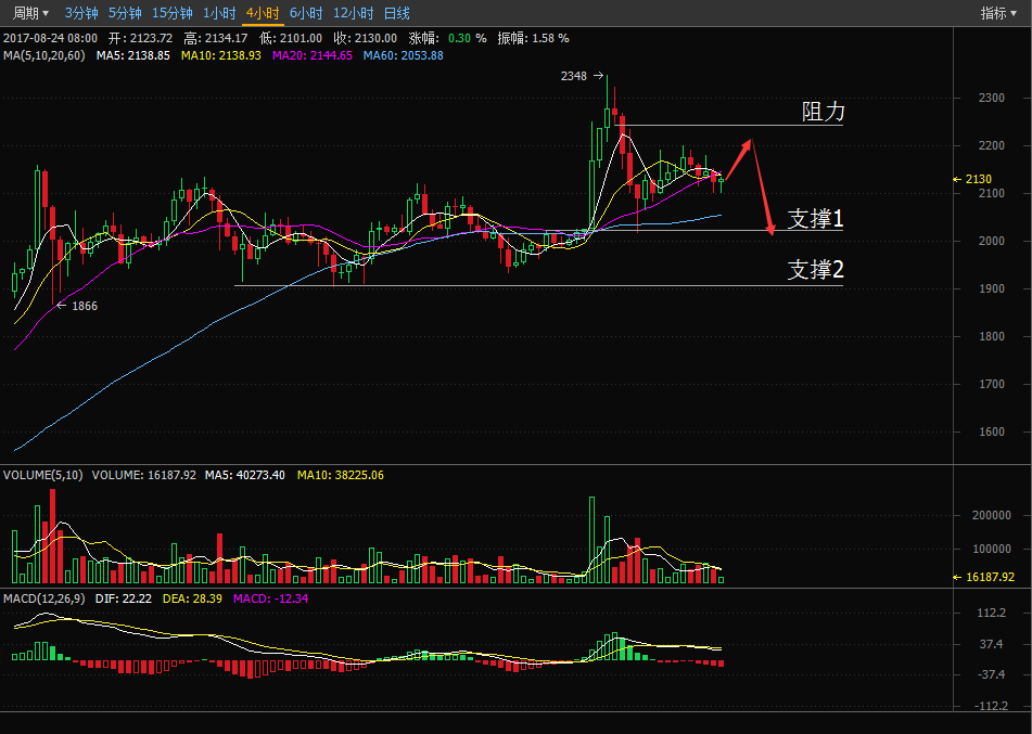 昨天日内价格持续震荡,略微上涨,成交量萎缩,多头力度偏弱,上攻受阻于2200附近压力位,短期内大概率将重新开启箱体震荡。4小时级别图形均线系统斜率略微上扬,短周期均线粘连走乱,市场成交量萎缩,多头力量表现不强,市场方向不明确,预计接下来行情将再次进入箱体震荡,关注2020-2200附近区域。短期内市场大方向暂不明确,中长线投资者最好以观望为主。