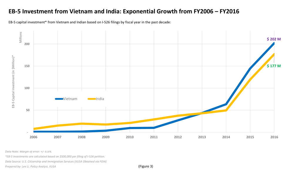 其中,亚洲地区的中国大陆、越南、印度、韩国、台湾、香港和日本地区的投资人占据了2016财年超过91%的I-526递件量。