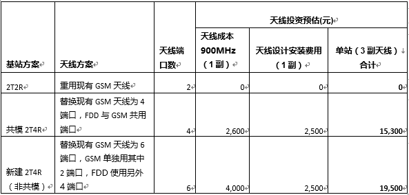 共模方式建设,一方面可以利旧GSM现网已经具备多模能力的RRU,节省设备投资成本,另一方面,可实现与GSM复用天线端口,大幅节省天线投资,具体分析如下面表格所示。