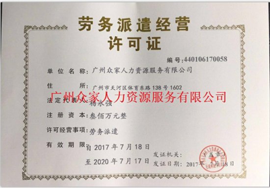 到目前为止,广州众家人力资源服务有限公司已获得人力资源服务许可证和劳务派遣经营许可证,公司除开展广州入户办理业务之外,同时涉足劳务派遣、教育培训,项目对接等多种领域,为企业单位输送急需的合格人才,为广大城镇务工人员寻找合适的务工单位,在珠江三角洲地区已经形成以开展广州入户为核心,多种服务并行的市场格局,以其专业的业务水准和良好的职业道德受到社会各界的普遍认可。