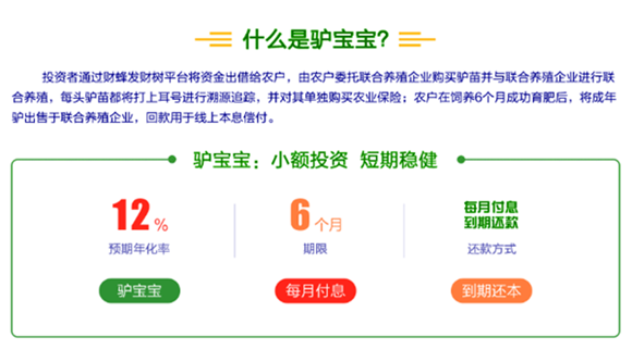 “三农”融资难题需要凭借互金技术优势,抛开地域短板,吸引城市富余资金回流农村。作为国内知名的纯中介金融信息服务平台——财蜂发财树,推出的“驴宝宝”一直有序不紊的在推进,从立项到壮大,凭借期限灵活短至6个月,100元低起点和预期年化收益率高达12%,成功的吸引了广大投资人,在当地政府收到了热烈支持与推广。