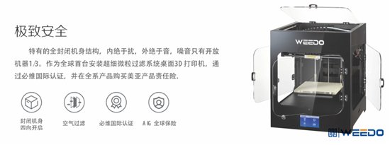 威宝仕一直将机器安全作为核心理念,特有的封闭机身,四向开启设计,在使用安全的同时,方便观察维护,全球首台安装有空气过滤系统桌面级3D打印机,并加入多种安全技术。