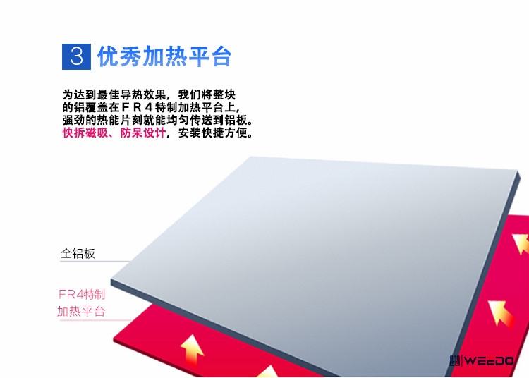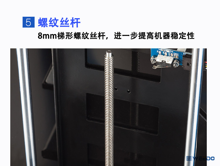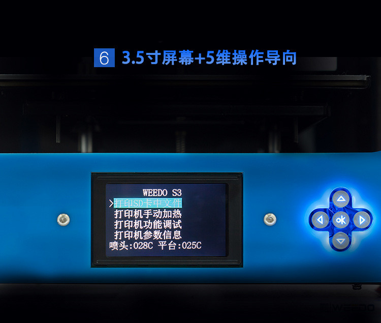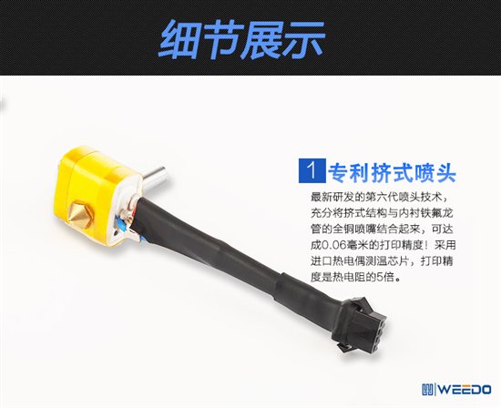 WEEDO系列打印机自主设计了桌面型3D打印机的机械结构,提高机体刚度,减少震动,大大提高了机器的稳定性和打印质量;对打印机控制主板等核心部件也重新创新,提高了电子控制系统的稳定性;从用户使用方便性的角度出发,自主研发了3d打印转换软件与主板控制固件;研究之前的喷头系统,设计了打印机的喷头系统,提高了打印稳定性和精度;并且提出了全封闭带过滤系统的设计,极大减少机器使用过程中产生的噪音和异味。