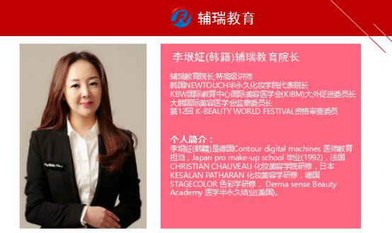 北京辅瑞教育韩式半永久化妆培训学院是由李垠姃(韩国)导师,作为辅瑞教育学院的院长,从事与研究半永久化术30余年,是办学近20年的韩国NEW TOUCH 化妆学院院长,李垠姃1992年毕业于法国CHRISTIAN CHAUVEAU 化妆美容学院,多次到日本、德国进修化妆美容学与色彩学研修,曾任职Professional Makeup School 院长、Beauty Line 半永久化妆学院 院长(2000年)、Lexy 嫁接睫毛学院 院长、YOU&ME皮肤科半永久院长(2002年)、德国 Contour digital machines 医师教育担当、新奇士果汁系列广告、三宝电脑广告、海泰饮料广告、乐天饮料广告、爱茉莉化妆品广告、KFC广告、报纸广告、VOSLENZA目录、JOINUS目录、京仁i-TV Morning Wide 化妆美容担当、S/S时装秀担当、娜轮婚礼礼堂 新娘妆、太平洋天然化妆品彩妆教育等等。现韩国NEWTOUCH半永久化妆学院代表院长、现中国北京BK辅瑞教育半永久纹绣培训学校院长,KBW国际教育中心国际美容医学会(KIBM)大外促进委员长、大韩国际美容医学会 监察委员长、第12回 K-BEAUTY WORLD FESTIVAL资格审查委员、Korea one stop中国支社半永久化妆教育担当、清潭金炳相整形外科,狎鸥亭THEONE整形外科美容顾问等,擅长半永久纹眉、半永久美瞳线、半永久水晶唇及半永久发髻线等培训技术。