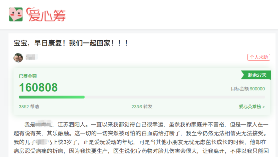 与和和一家相同,病魔的突如其来和高昂的治疗费用让家庭不堪重负,网上筹款便成为了最后一搏的希望。爱心筹大病筹款平台就是网上筹款平台中的佼佼者,它依托微信朋友圈的力量,扩大患者的自救能力,自2015年上线以来,凭借严格的审核机制和1对1筹款顾问服务,累计帮助了数十万大病家庭,覆盖全国3亿多爱心群体,成为医疗大病筹款领域首屈一指的专业平台。