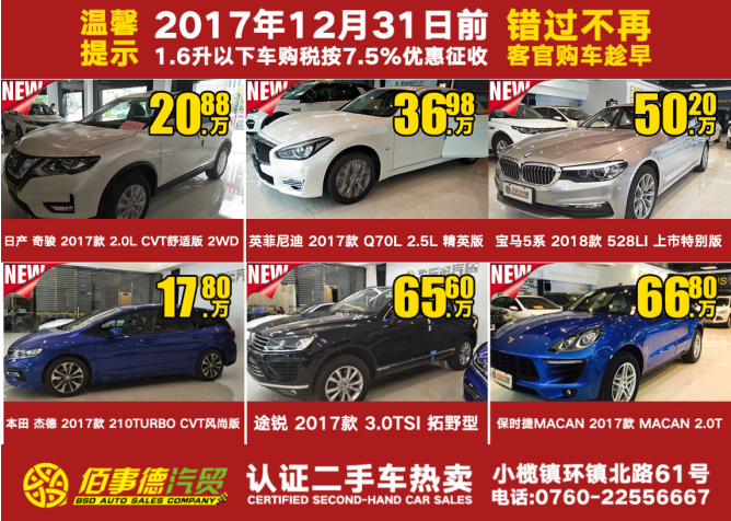 小榄佰事德汽贸有限公司致力于订购各大品牌新车、二手车正规交易,汽车系列售前售后保养服务,为广大客户解决买卖新车、二手车的难题,在佰事德,车主可以订购全系列品牌新车,同时也可以选购佰事德自有的二手车,这里的每一辆二手车都经过权威360°检查,且获得官方认可的。