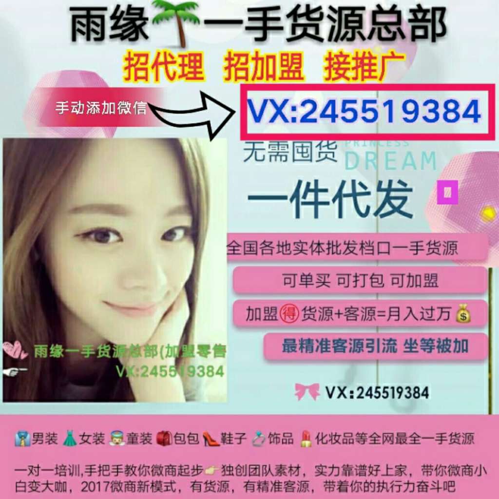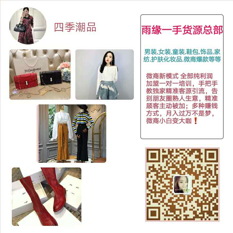 随着互联网络的迅速发展,随着目前微商越来越正规化,越来越多的人都在网络上买东西,人人都已接纳了这个微商时代,那么坐在家里一部手机就能赚钱的模式早已开启,就看你能否把握住机会,全职妈妈想要建立自己的经济来源,学生想赚更多零用钱,上班族想要多赚些外快,无论那一类人可以说都适合做微商,可是现在的微商什么都有的卖,想要稳定发展必定懂得选择长线产品,微商产品多,种类齐全,满足不同顾客的需求,还是很好做的!雨缘一手货源拥有全网最全的货源(男装;女装;童装;鞋子;包包;饰品;眼镜;手表;家纺;化妆品;零食等)8000家一手货源,全部实拍,中高低档俱全,一手拿货,价位最低!一手货源可单买、可打包、可加盟。做微商想找一手货源就来雨缘8000家一手货源总部(咨询VX:245519384)