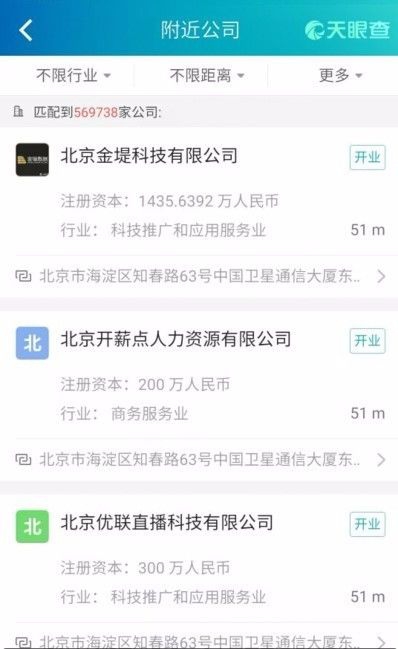 例如,商务人员在中关村附近参加某会议,会议结束后想要进行附近业务拓展,可打开天眼查app,按照以上步骤,即可查看附近企业,通过筛选选定相关合适的企业。