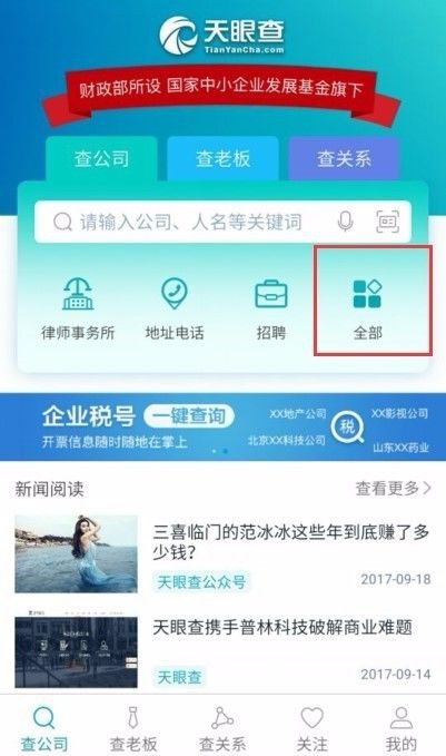 点击天眼查首页的【全部】按钮,然后进入下一步。