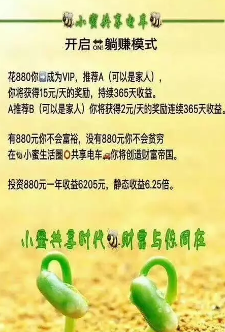 VIP可以拥有认购权,3880元/台,你可以持有70%的股份。持续3年,每天可以获得收益,看得见,收得到!小蜜生活共享电单车全国加盟中心微信:QQ9968134