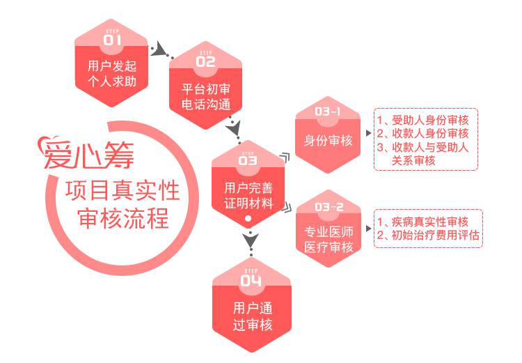 1对1的筹款顾问团队,第一个与病友接触,既辅导病友准备资料发起筹款,又负责最初步的审核工作,如病友的身份信息、患病状况、治疗进展和花费等,“求助人、收款人以及双方的关系等,只有这些信息确认无误才能顺利发起筹款并最终提现。”而在这之外,爱心筹志愿者团队,也会通过实地探望病友的活动,对患者情况进一步核实。