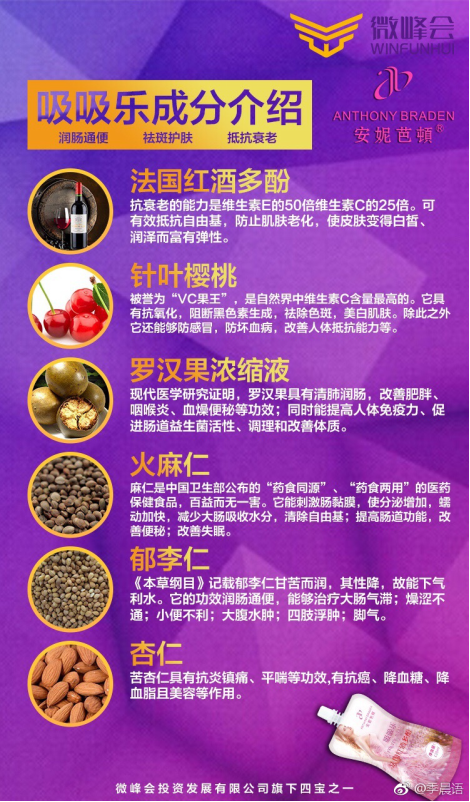 吸吸乐是微峰会独家运营的产品,是由广东橙天绿宝生物医药开发有限公司出品的!创立于2006年,是一家集研发、生产、设计于一体的现代化保健食品、食品及化妆品企业,由美国联合基因研究所技术授权。