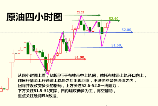 原油昨日高位拉锯过山车,亚欧盘先行探高52.51附近承压,探高未突破前一日高点,最终美盘时段承压回测。刷新日内低点至51.48.回踩支撑再反抽收高在52.0上方,反复的过山车以进行高位震荡蓄势。日图最终收盘十字阳K线。日图下探收高。属于多头当中的强整理,昨日接近了上升趋势线的支撑51.0附近,只是未完全触及到做多点位,随着日图的收高,短线依旧偏多,只是过程相对反复了一点,容易出现昨日那种拉锯震荡,故操作上尽量不要追涨杀跌。以回调后低位择机做多为主。4小时快调快收复,守住台阶上升通道中通道,昨日接近趋势线51.0上方守稳,那么今日将依托此位做防守看震荡多头,随着昨日的整理蓄势。接下来有望形成突破。毕竟在高位强整理蓄势。量能上具备冲高,就看今天能否进一步续量上升了。今日支撑在51.50 防守点51.0.