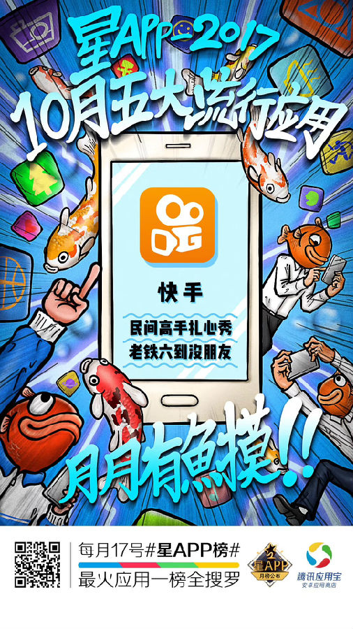 10月17日,腾讯应用宝发布“星App”九月十大潮流应用榜单,快手成为上榜的唯一短视频应用。据应用宝官方数据显示,快手取得了9月评分得分最高的亮眼成绩,应用宝市场下载量超过7300万,仅单月新增下载量就超过500万。