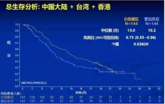 仑伐替尼组中位总生存期为15.0个月,索拉非尼组为10.2个月(其中,HBV相关肝癌患者仑伐替尼比索拉非尼整整延长5个月);