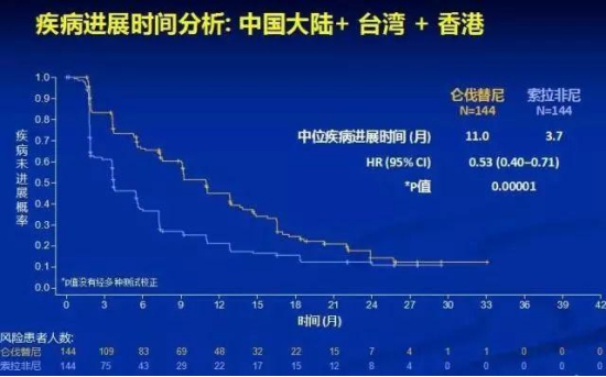 仑伐替尼组的中位无进展生存期为9.2 个月,索拉非尼组为3.6 个月;
