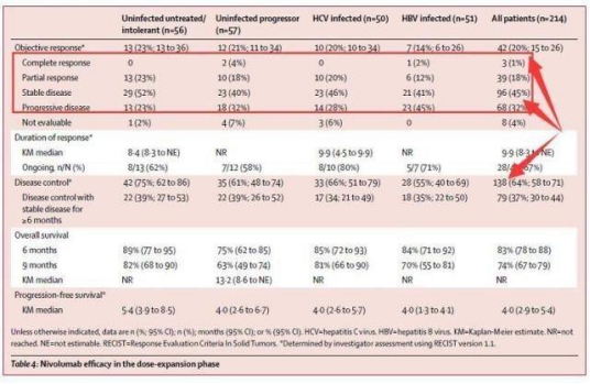 Checkmate-040试验是一个由214名晚期肝癌患者参与的临床试验,单药使用Opdivo(剂量3mg/kg,2周一次)可以使43名患者的肿瘤缩小至少30% ,客观有效率达20%; 使94名患者的肿瘤稳定不进展,疾病控制率高达64%; 9个月生存率达74%。