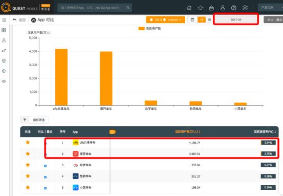 另外,QuestMobile数据还显示,在中国整个App市场活跃渗透率方面,ofo9月活跃渗透率为3.94%,环比增长近16%,位居共享单车行业第一;摩拜活跃渗透率为3.75%,环比增长5%,位居行业第二。数据对比可知,ofo的活跃渗透率增速是摩拜的3倍之多。同时,ofo9月的月活用户规模环比上涨16.5%,其活跃用户规模增速也是摩拜的3倍。