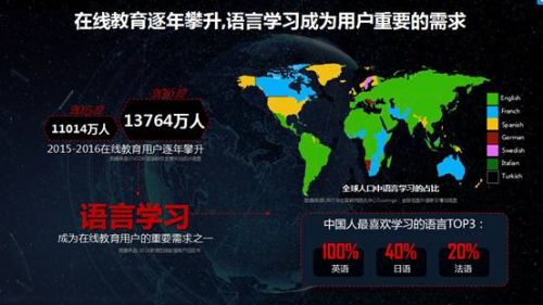 中国互联网信息中心CNCC互联网发展调查报显示,在7.51亿中国网民中,通过即时通讯工具获取知识、分享知识的占比为92.1%。同时在线教育人群不断提升,截至2016年12月已有近1.4亿人选择在线教育途径进行学习,其中语言类学习占比最大,这与出境游、报考MBA升职加薪的人群增加成正比,也进一步印证了语言学习是自我提升,视野拓展的有效途径之一。