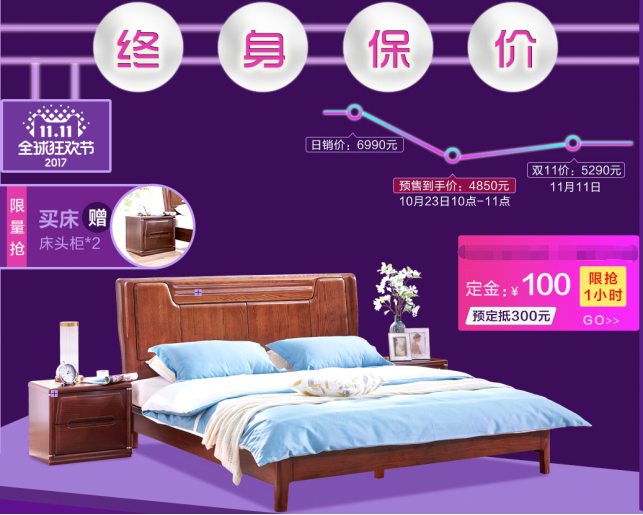价格回到六年前!日销价6990元的简约现代全实木红橡木双人床,预售时间内预定,最终到手价只需4950元,更有1111张免费床垫等你来拿!