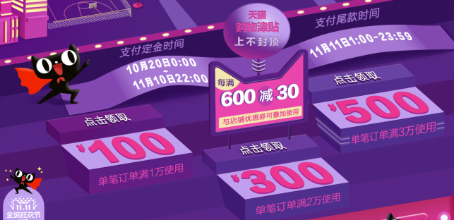 除店内价值100元、300元、500元的代金券以外,还有天猫购物津贴:每满600元就减30元,还可以与店铺优惠券叠加使用!