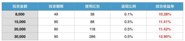 活动期间投资票票宝小于60天的产品即可获得0.1%的现金返现,投资60-120天的产品即可获得0.5的现金返现,值得注意的是,此部分为全额返现而非年化返现,新手红包可以同时使用,极限加息,最高可达年化12.9%!