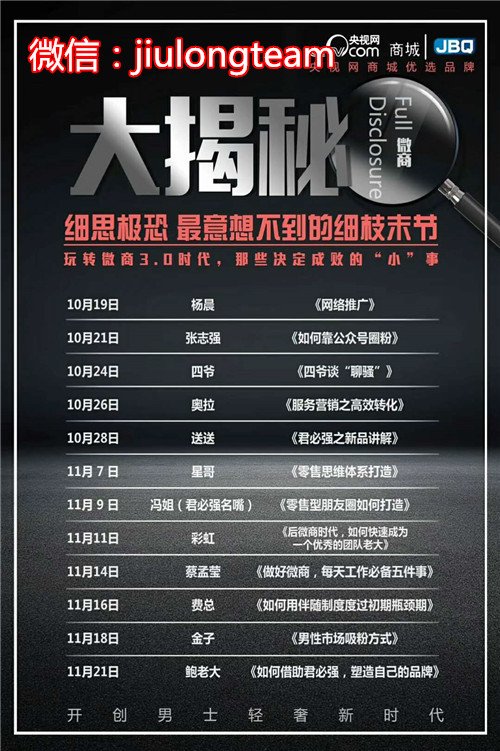 现在你只需要手动添加微信号,或者扫扫二维码,即可就能开启你微商航程。2017年君必强武松团队愿大家一起并肩作战,实现财富自由梦。微信:jiulongteam
