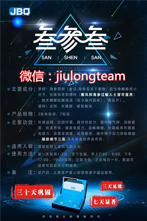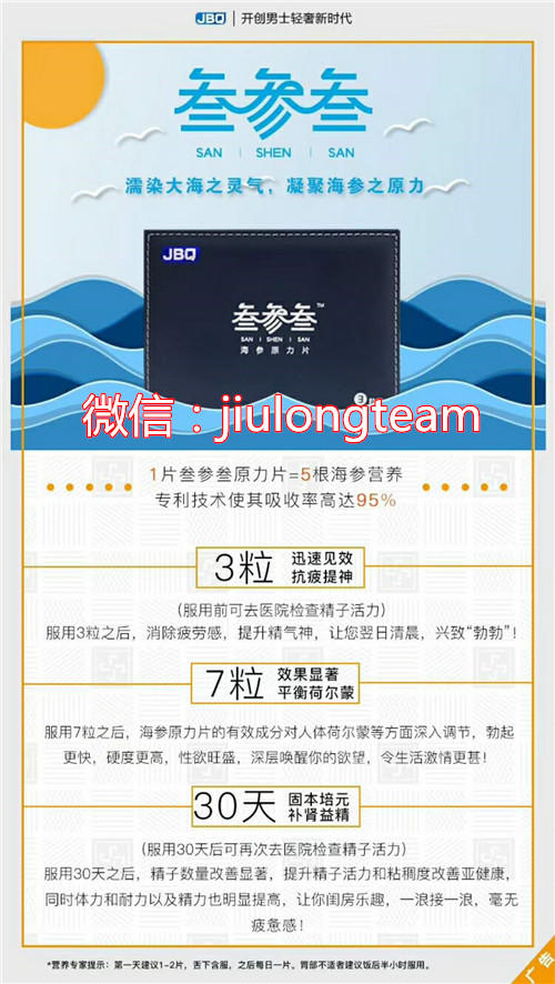 君必强!有产品有团队者的天下!君必强团队的精英遍布大江南北,成功推出一款保健品“叁参叁海参原力片”,这是款能让代理们业绩翻倍的产品,让每个团队成员以低投入、高回报的形式,高效赚米!君必强团队微商招募叁参叁海参原力片代理,欢迎加入!微信:jiulongteam