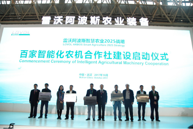 10月26日,雷沃阿波斯智慧农业2025战略暨百家智能化农机合作社建设启动仪式在2017中国国际农业机械展览会期间举行。农业部农业机械化管理司、农业机械实验鉴定总站、农业机械化技术开发推广总站、中国农业机械工业协会、中国农业机械流通协会、中国农业机械化协会及雷沃阿波斯农业装备有关领导及行业专家参加了启动仪式。