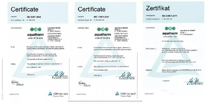 据了解,目前市场上仅有极少数家装进口管道品牌同时拥有GB、ISO和DIN质量认证,德国阔盛是其中之一。自1996年起至今,德国阔盛的家装进口管道产品就已符合DIN ISO 9001质量管理体系要求, 2012年TUV认证得到了延伸,通过了ISO 14001环境管理体系的认证,之后又通过了ISO 50001能源管理的认证。并且德国阔盛为了顺应国内市场对家装进口管道的要求,进入中国期间,德国阔盛的家装进口管道产品更是以最高的国际标准获得了GB的认证。