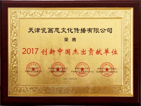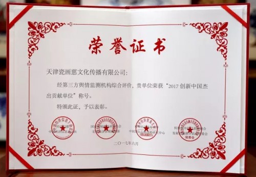 会上主办方发布了《2017中国创新与经济融合发展大会暨创新成果推介活动—中国企业创新力舆情分析报告》。报告针对一年来我国网络、金融、文化等多个产业领域内优质企业的创新发展做出了数据化的统计、分析与点评。天津瓷画慈文化传播有限公司以优异的成绩脱颖而出,荣膺“2017创新中国杰出贡献单位”。