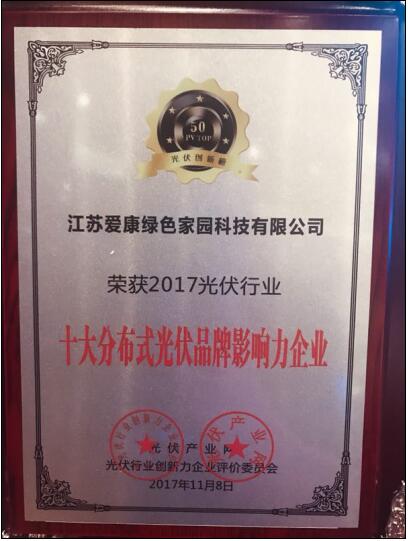 爱康绿色家园凭借在户用分布式领域的不断探索和贡献,荣获“2017光伏行业十大分布式光伏品牌影响力企业”大奖。这是继本月爱康绿色家园荣获光能杯”CREC年度家用光伏品牌大奖、CREC2017中国十大户用光伏品牌之后,爱康绿色家园荣获的第三项年度分布式大奖。