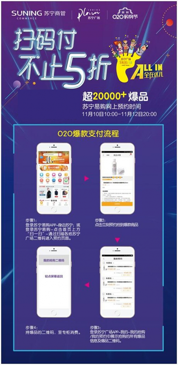 从11月1日开始,苏宁置业旗下苏宁广场、苏宁易购生活广场、苏宁酒店等全面助力双十一购物狂欢节。苏宁广场作为苏宁O2O实体零售商业体验中心,携手2000个商家,线上线下推出40000余款爆品,同时落地 “嗨购市集”“全民轰趴不眠夜”等精彩活动,真正做到双线融合、购物零时差。