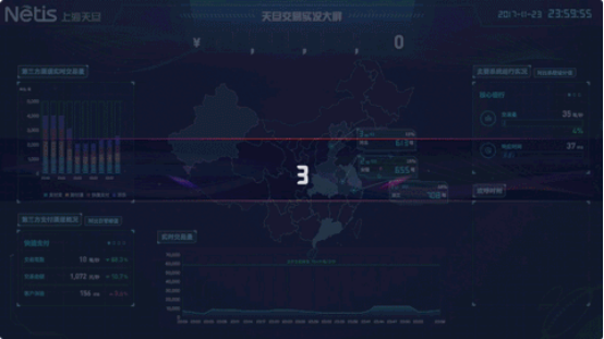 在某城市商业银行数据中心,天旦Team Vision双十一大屏实时刷新,为用户提示双十一每一个重要时刻: