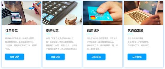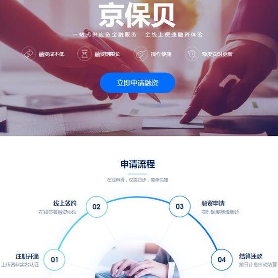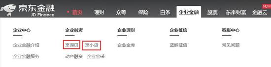 打开网页版“京东金融”后,点击进入 “企业金融”,这里的企业融资板块里有最能帮到你的两位“财神”——京小贷和京保贝。