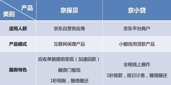 但即使长在一根藤上的葫芦娃,也有各自的使命。二者最大的区别是服务对象不同:京保贝主要面向京东自营供应商;京小贷则主要面向京东的平台商户,即第三方卖家。
