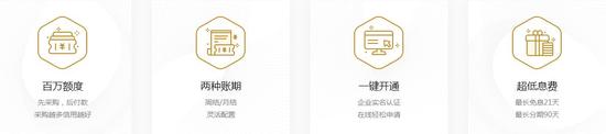 在京东企业金融众多亮点产品中,隐藏最深的可能是企业融资板块里的企业金采(jc.jd.com)。企业金采是京东企业金融为优质企业客户提供信用赊购、账期管理等服务的金融产品,评定信用额度后,企业可在京东商城使用“先采购、后付款”的信用支付服务。