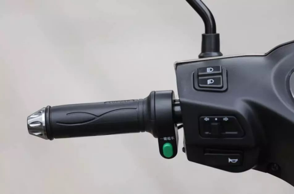 右转把各开关说明:从上至下分别是日间行车灯和大灯开关、喇叭,绿色按钮是动力档和经济档选择。