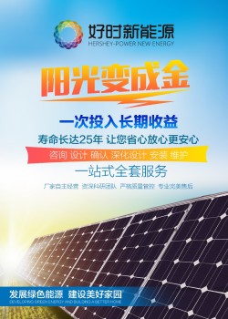 常州好时新能源光伏发电生产厂家是一家专业从事新能源研发、销售、服务一体化全产业链的太阳能电力运营商,公司成立于二零零六年, 仅用十余年的光景,现如今常州好时新能源已经发展为可为全球各地的民用,商用,公用以及大规模公共设施提供清洁能源方案,专业化产品服务。