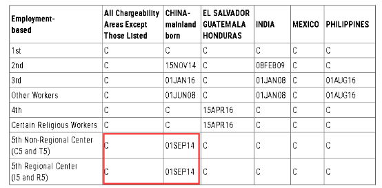 值得关注的是,在表B即递交申请日(DFA)表上,中国大陆出生投资人的截止日期则倒退一月,为“2014年9月1日”。同时,EB-1杰出人才签证类继续保持无排期状态,意味着申请人一旦审批通过可迅速获得绿卡。