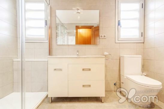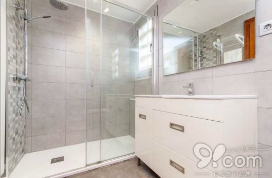 卫生间欧式风格设计,浴室带有玻璃门,一侧有窗户,便于室内通风和采光,墙面和地面均贴有高级瓷砖,防水且便于清洁。