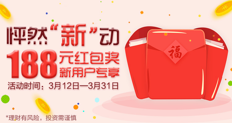 老用户要好礼回馈,光大云富对新用户更是诚意满满。第二重好礼,就是针对新用户的“怦然‘新’动,188元红包奖新用户专享”。3月12日-3月31日,新用户完成注册后,即可获得1.8%专享福利券一张,增加福利期限18天,福利券有效额度为2万元。而且,新用户累计投资满一定金额,即可获得相应红包奖励——累计投资满8万元,可得现金红包118元;累计投资满12万元,可得现金红包188元。