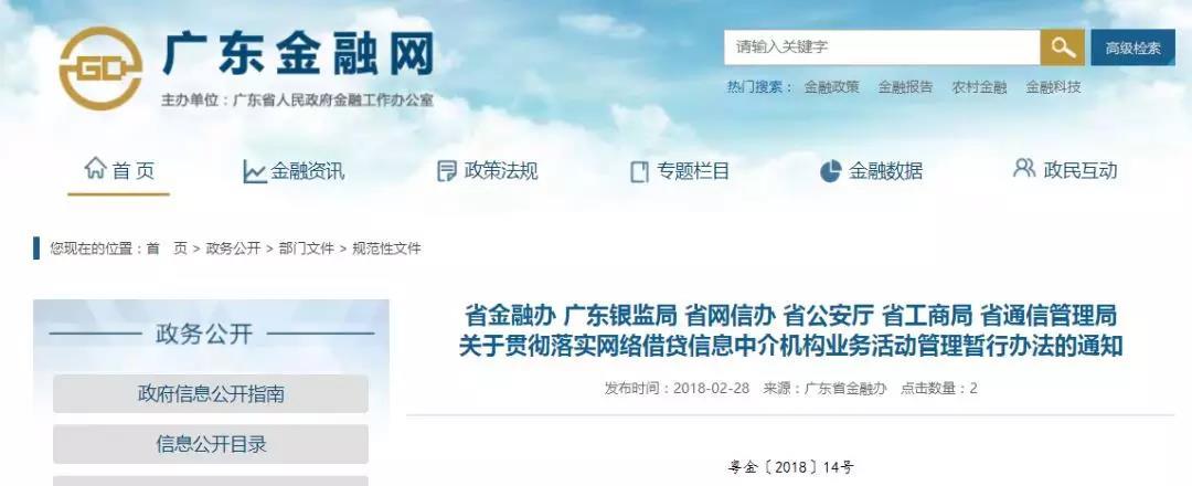 中国网财经2月28日讯(记者 肖娟)2月28日, 广东省金融办在官网发布了《省金融办 广东银监局 省网信办 省公安厅 省工商局 省通信管理局关于贯彻落实网络借贷信息中介机构业务活动管理暂行办法的通知》(粤金〔2018〕14号)(以下简称通知)。通知对加强市场准入、实行备案登记制度,坚持穿透式监管,加强失信约束惩戒,暂停开展校园网贷业务,落实银行存管等26项网贷机构业务活动相关重点问题进行了说明。