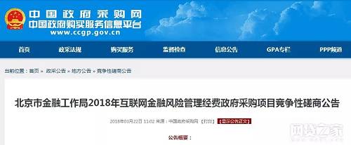 据网贷之家报道,3月22日,中国政府采购网发布了一条《北京市金融工作局2018年互联网金融风险管理经费政府采购项目竞争性磋商公告》(下称“公告”)。公告中包含采购的相关费用及《北京市金融工作局2018年互联网金融风险管理经费项目采购需求》(下称“采购需求文件”)。