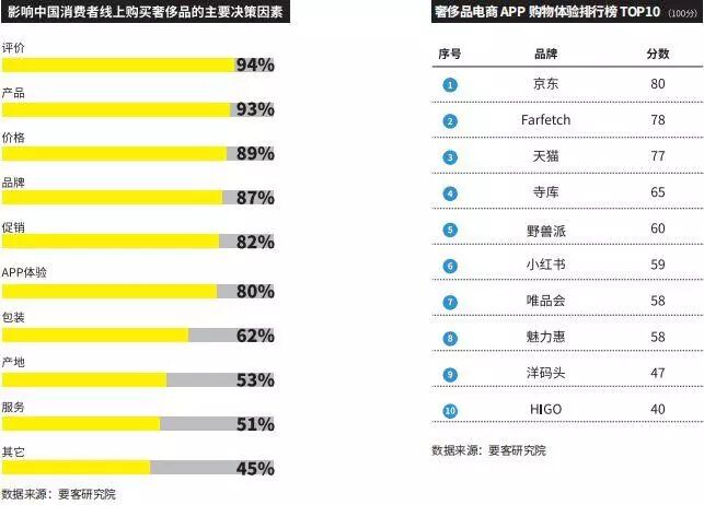 在要客研究院发布的《中国奢侈品电商报告》中,我们也看到,有很多因素在影响着消费者购买奢侈品。在所有影响消费者购买奢侈品的决策因素中,94% 消费者认为会受到评价的影响,其次是产品(93%),第三是价格(89%);但是值得注意的,APP 体验(80%)也是影响消费者线上购买奢侈品的重要因素之一。通过同行评价以及客户评价,京东与Farfetch 的APP 购物体验最受好评,主要涉及APP 的页面设计、响应速度、产品检索、支付方式、订单管理、客服模式、物流服务、产品品质、品牌等级等维度。