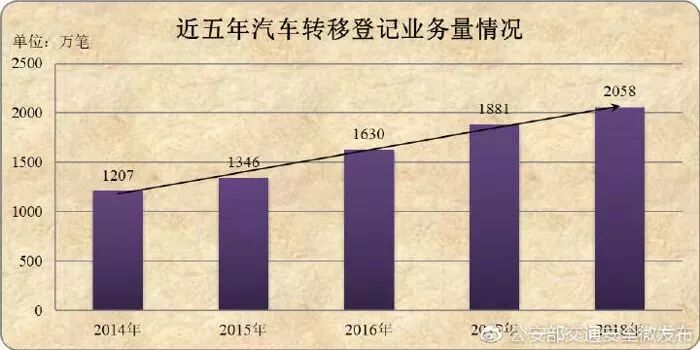 此外,汽车转移登记业务量持续增长,二手车交易市场日益活跃。2018年,全国共办理机动车转移登记2128万笔,其中汽车转移登记2058万笔,占96.72%,比2017年增加177万笔,增长9.44%。从统计情况看,近五年汽车转移登记与注册登记业务量的比例由0.55上升至0.77,反映出二手车交易市场日益活跃。
