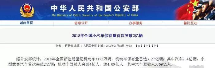 日前,盖世汽车获悉,公安部交通管理局官方微博和公安部网站相继发布统计数据,2018年全国新注册登记机动车3,172万辆,机动车保有量已达3.27亿辆,其中汽车2.4亿辆,小型载客汽车首次突破2亿辆;机动车驾驶人达4.09亿人,其中汽车驾驶人3.69亿人。