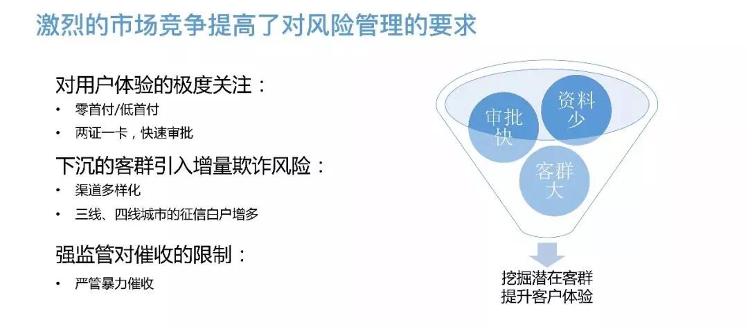 整个市场竞争非常激烈,给风险管理工作提出了更高的要求。首先是我们对用户体验的极度关注,从产品设计来说,现在有大量的零首付和一成首付的金融产品,同时提交的资料是越来越少,大家都在做两证一卡,快速审批。这的确是市场对于汽车金融、融资租赁公司的要求,我们竞争对手这么做,那我们也必须要这么做。这就要求我们在仅有的这些资料情况下,依然能够获得这个客户的信息,减少对客户的打扰。