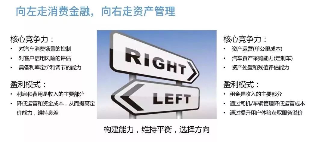 所以这是我们认为的目前行业里面汽车金融公司,融资租赁公司可以选择的两条路,大家目前还是偏消费金融的成分多一些,慢慢的有大量的公司去做直租,然后从直租再做分时租赁往资产管理这条路在走。