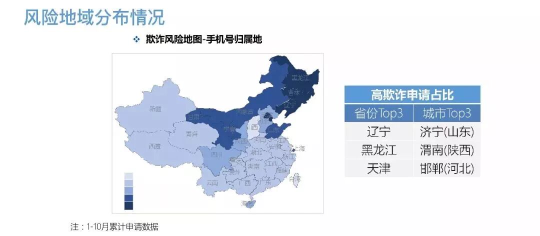 下面我们从地域的视角去分析一下风险分布的情况,这是同盾大数据在1到10月份累计的申请的数据情况,我们从欺诈风险的浓度去判断,会发现整个风险从中国的南部往北部移的趋势非常明显。整个东北是我们欺诈风险最高的三个省,蒙古、宁夏、甘肃、山东,都是一些相对来说比较高危的省份。如果有机构正在做产业,那么渠道怎么去布,每个省份的风险定价是怎么样,希望这里能对大家有一些启发,一些思考。